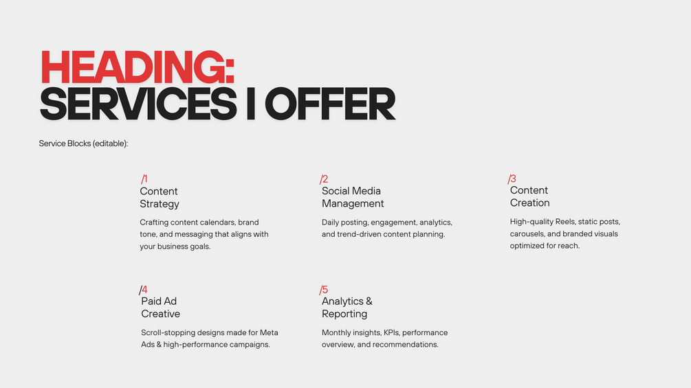 A ready-to-use Canva Portfolio Template for social media managers, freelancers, and UGC creators. Designed to help you present your services, case studies, results, and workflow professionally—without any design skills. Build credibility fast and impress clients instantly with a clean, modern layout.